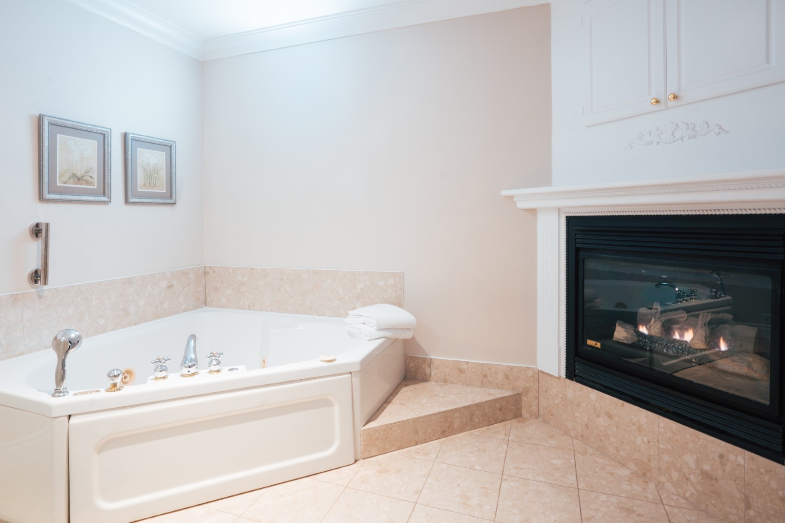 This is our most elaborate Signature Suite featuring a large bathroom with a corner whirlpool tub, a double-sized shower equipped with body sprays, a gas fireplace and a television. The bedroom has yet another fireplace, a 3D television, and a king size bed. From the bedroom, there are doors that open onto a cozy sitting room equipped with a wet bar – including a refrigerator, microwave and coffee maker – as well as another television; a LCD flat screen with DVD/Blu-Ray player.